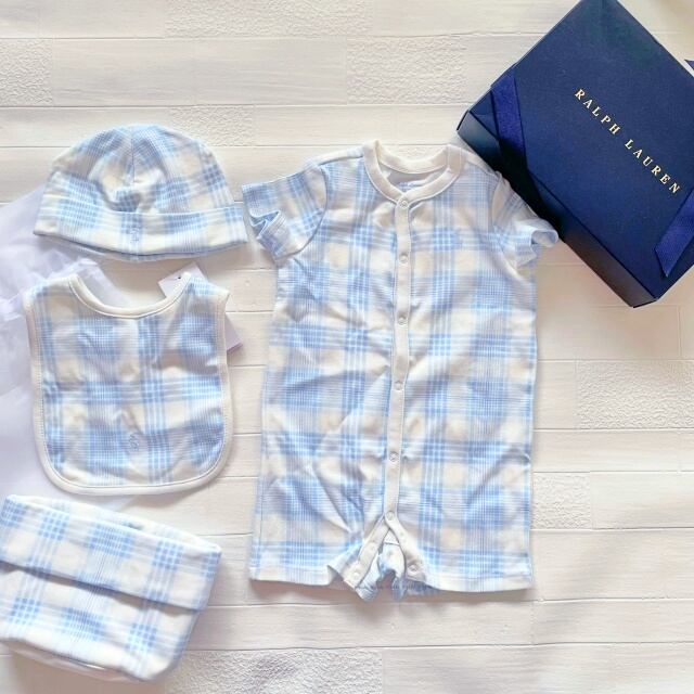 ポーチ、ロンパース、スタイ、帽子の4点セット