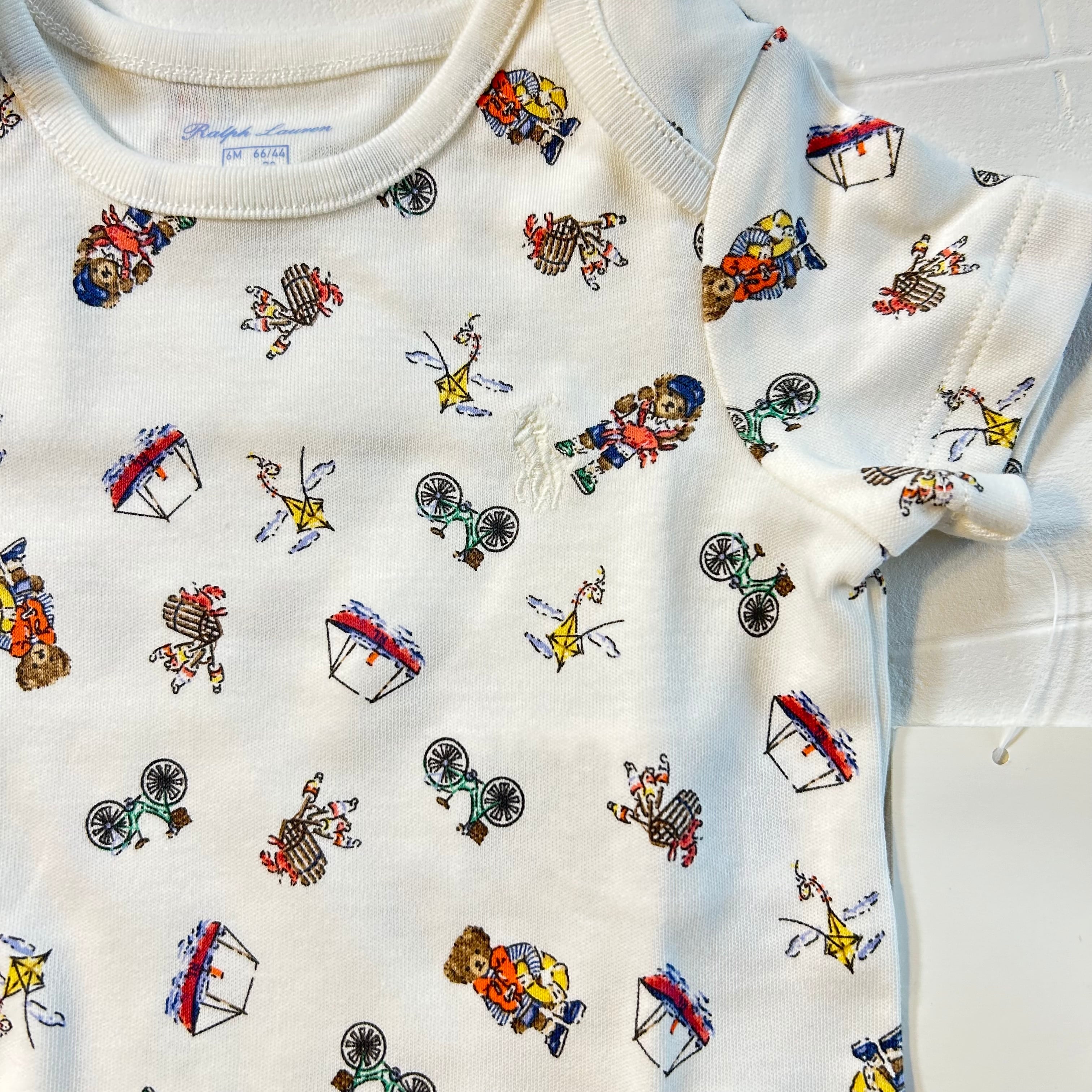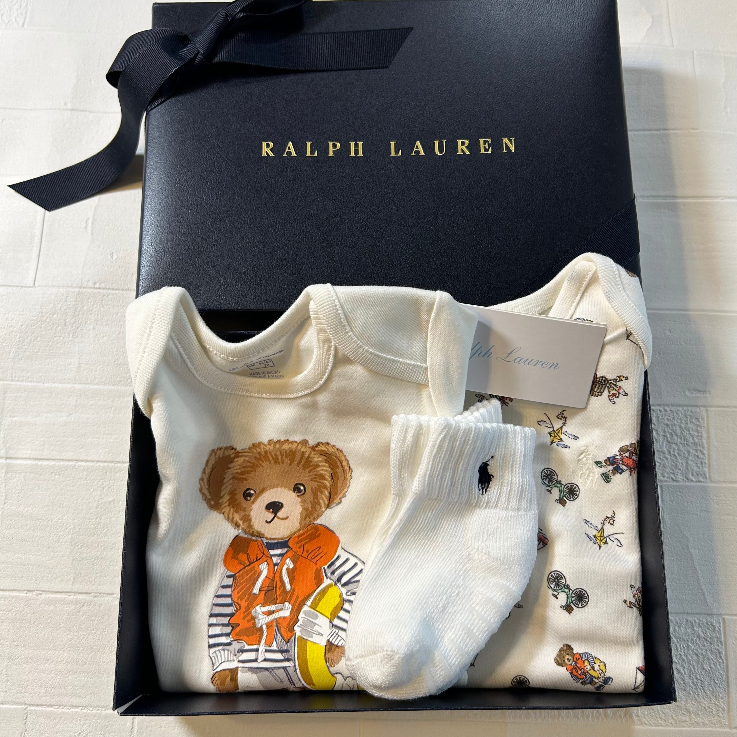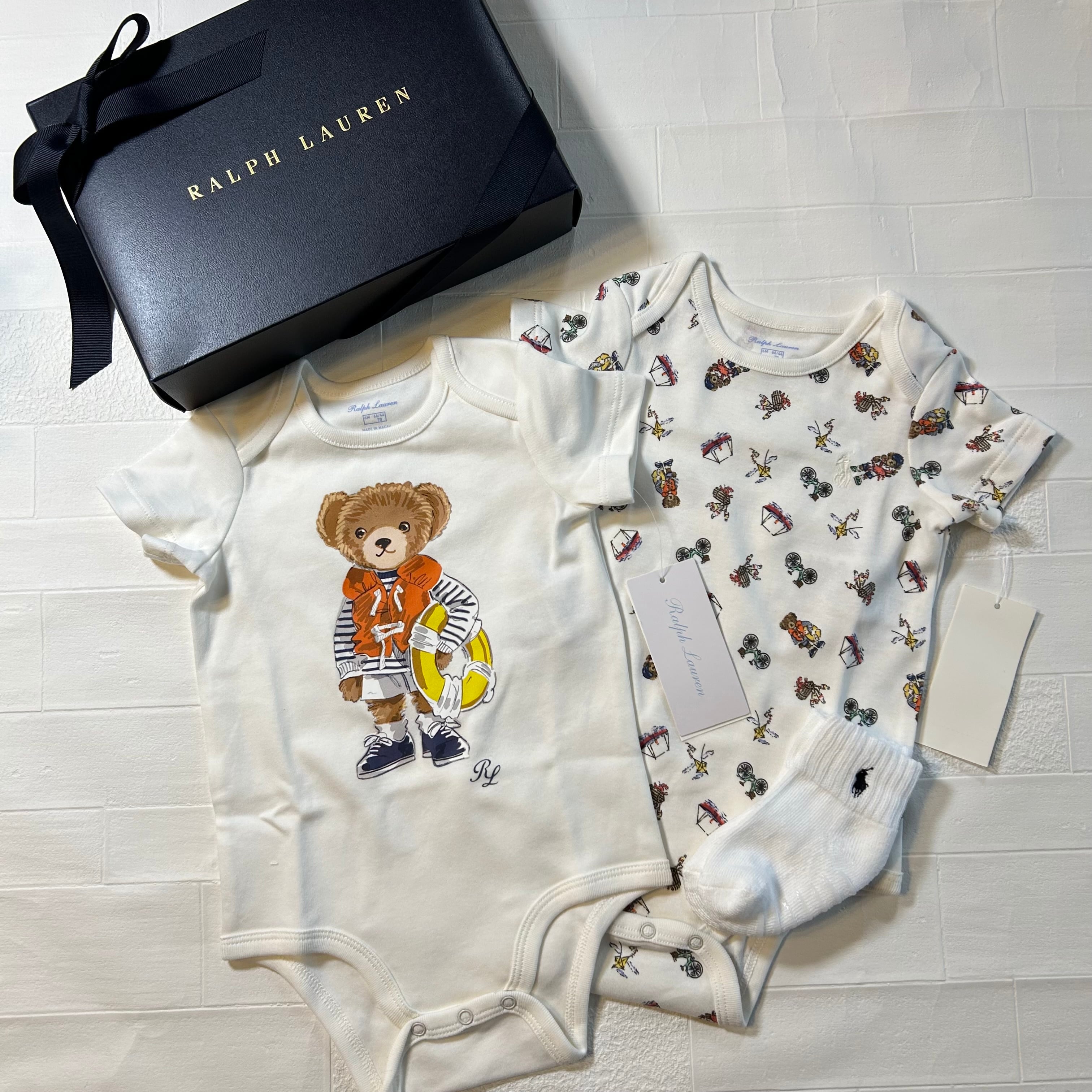 ・ボディスーツの1つは、フロント中央にPoloベアと"RL"の文字のプリント / もう1つには、Poloベアのパターンを全体にプリント