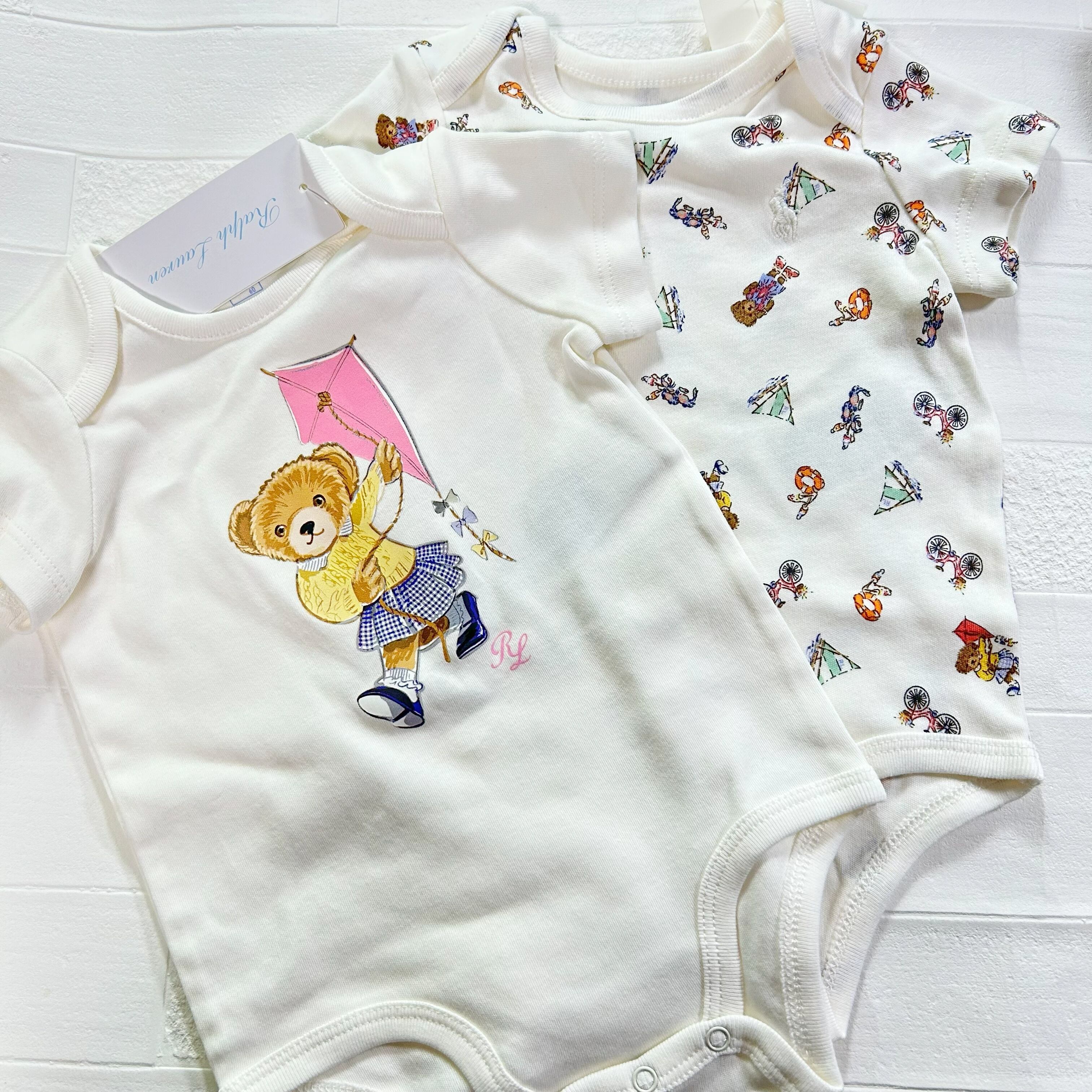 可愛いベア柄の半袖ロンパース2枚セットです。